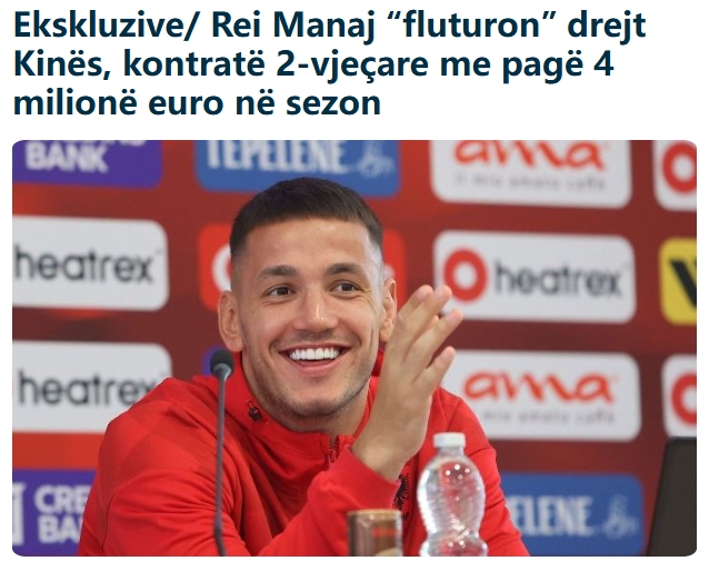 媒体表示,马纳伊将与浙江签约2年,年薪400万欧,他将成为阿尔巴尼亚薪水最高的球员之一。28岁的马纳伊现效力阿联酋的沙迦队,本赛季各项赛事为球队出战20场收获6球。
