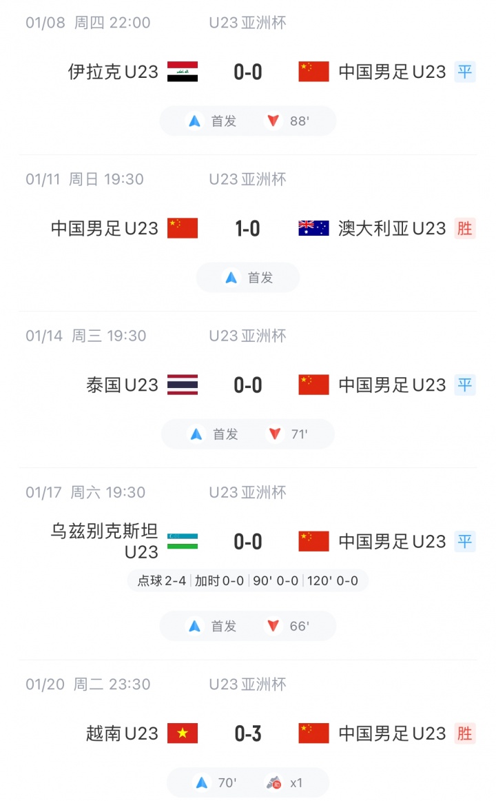 01月24日讯 U23亚洲杯决赛,U23国足vs日本U23。上半场比赛,U23国足0-2落后日本U23。
